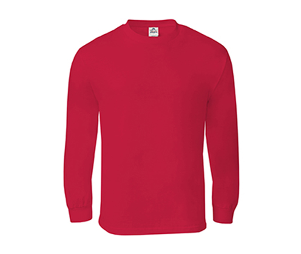 Men's red long sleeve tee. Set-in rib collar with shoulder-to-shoulder taping.