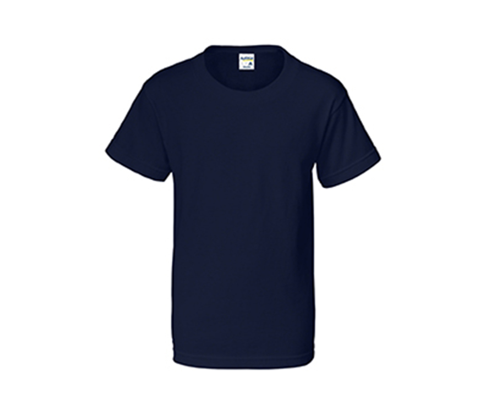 Youth standard navy tee. Set-in rib collar with shoulder-to-shoulder taping.